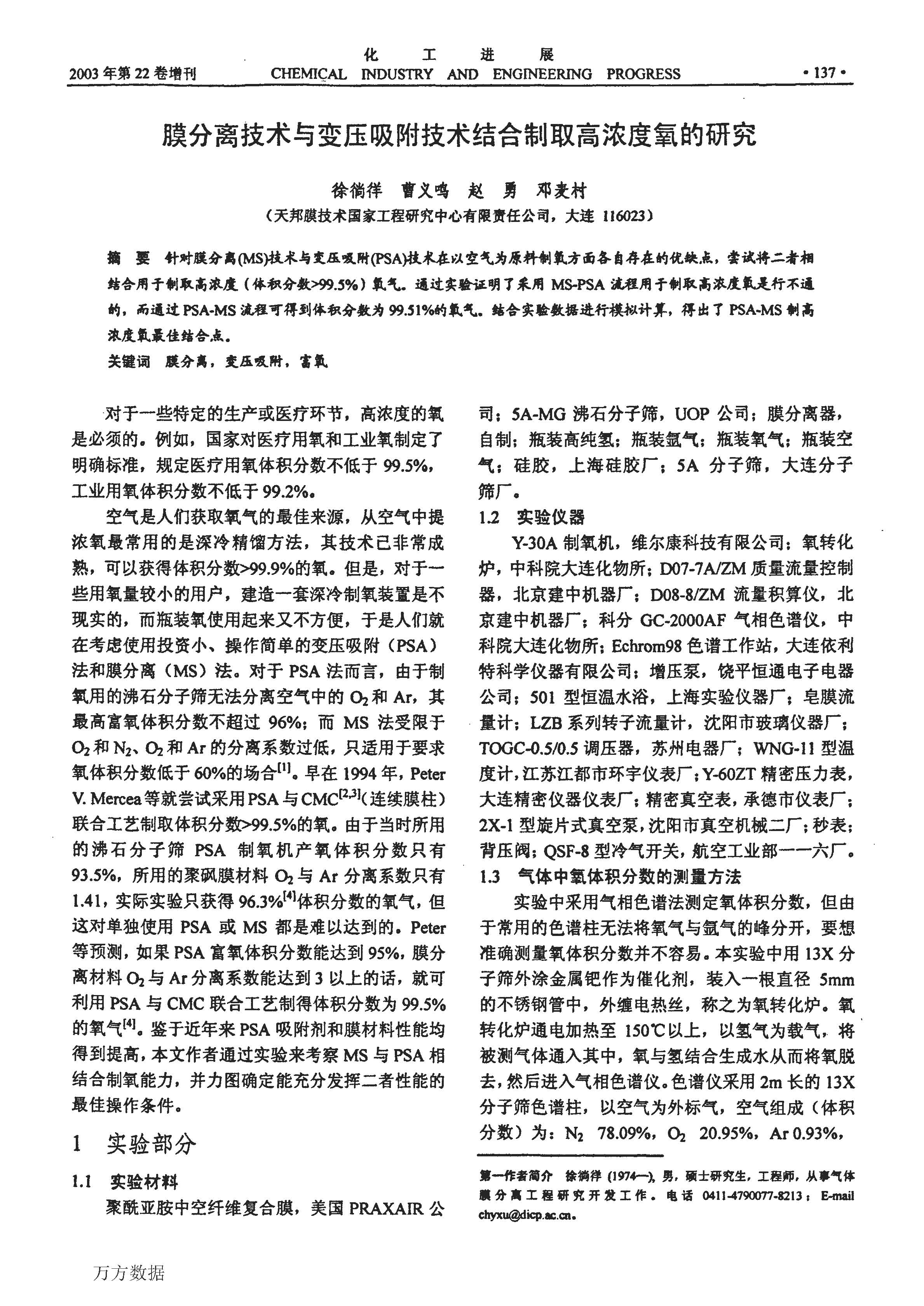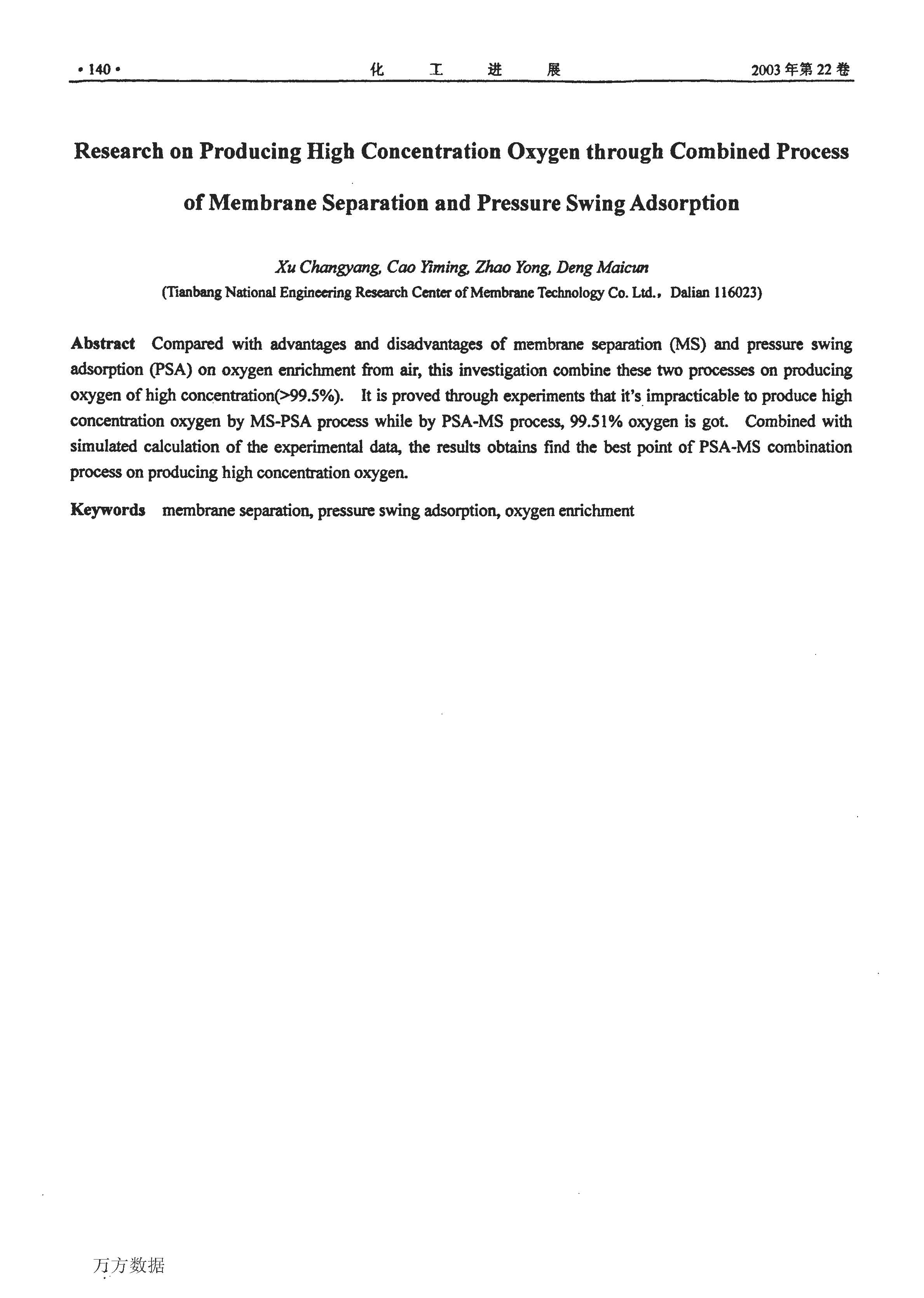 膜分離技術與變壓吸附技術結合制取高濃度氧的研究
